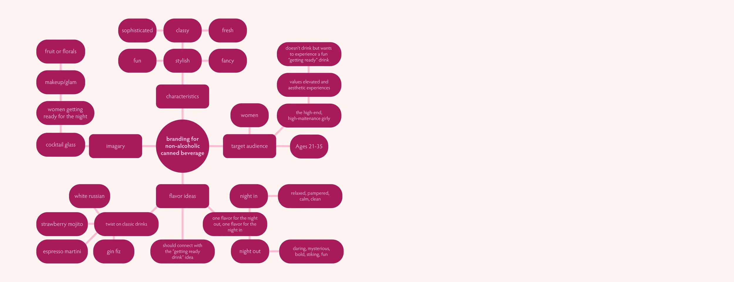 To establish a clear brand identity, I used mind maps, mood boards, and competitive analyses. I identified the target audience as women ages 21–35 who value aesthetic, curated experiences. From there, I brainstormed brand values, imagery, and flavor concepts that aligned with both the audience and the mood board. Once Posh’s identity was defined, I moved into the design phase.